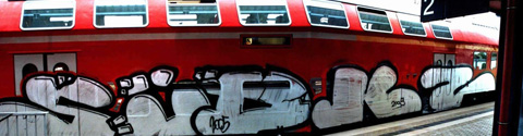 Mozer: Es war einmal im antiken Rom... Play, Eiht, und ich wollten einen Zug malen. Die Züge standen in einem riesigen Yard. Dieser wurde von einem ca. 5m hohen Zaun mit Stacheldraht abgegrenzt, der mit Mühe und Not bezwungen wurde. Als wir mit unseren Dosen am Zug standen, wurden wir schon vom Wachschutz bemerkt, die mit ihren MGs (oder Taschenlampen) auf uns zu gerannt kamen. Alle zurück durch den großen Dschungel, mit seinen scheiß südländischen Hartlaubgewächsen, der mitten in der Wendeschleife lag. Irgendwie kam ich auf die Idee mich da zu verstecken, die anderen waren da schon weiter weg. Es folgten einsame 5 Stunden voller Paranoia und Mückenstiche. Bei Sonnenschein dann unbemerkt weg. Im nächstgelegenen Park sah ich dann zwei Penner auf dem Rassen schlafen, sie entpuppten sich als Eiht und Play.